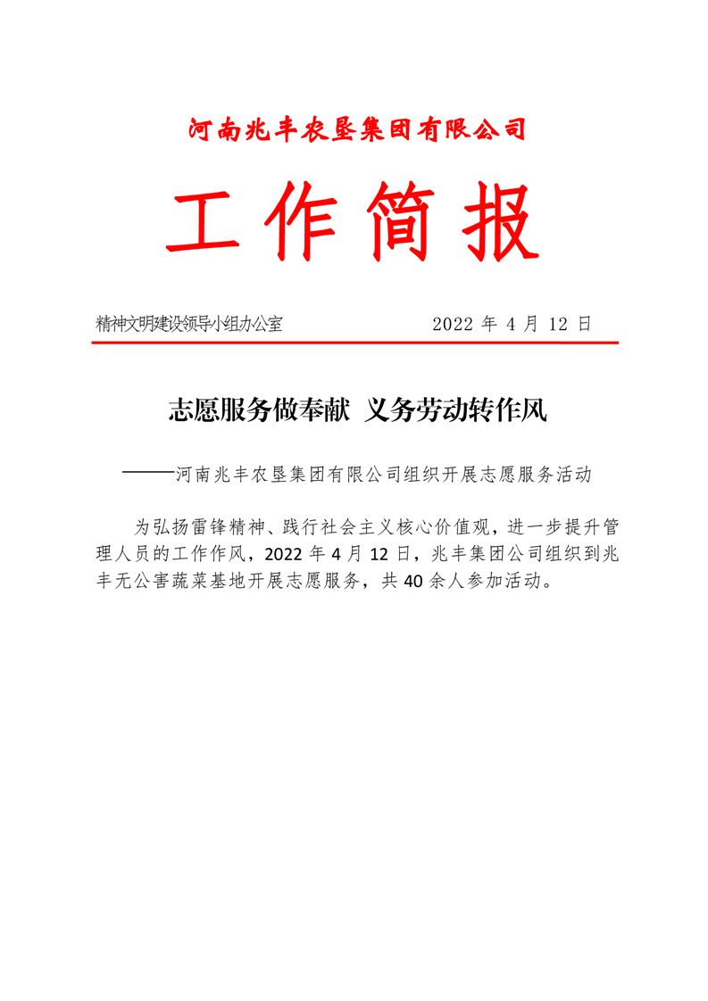 · 志愿服務(wù)做奉獻(xiàn) 義務(wù)勞動(dòng)轉(zhuǎn)作風(fēng) ——河南兆豐農(nóng)墾集團(tuán)有限公司組織開(kāi)展志愿服務(wù)活動(dòng)