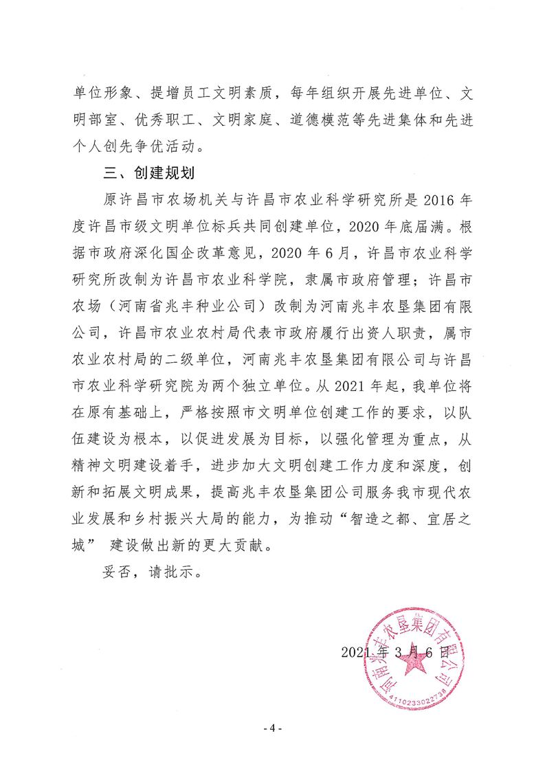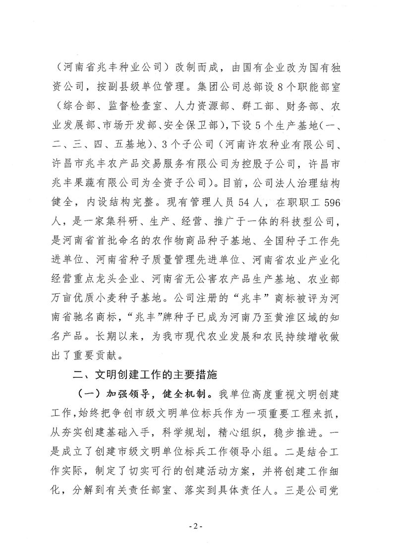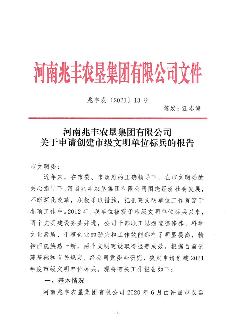 · 河南兆豐農墾集團有限公司 關于申請創(chuàng)建市級文明單位標兵的報告