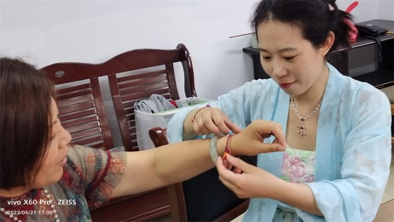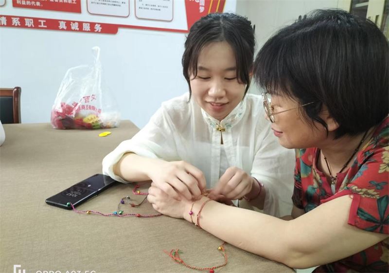活動前,公司職工食堂提前準備好了粽葉、糯米、蜜棗等食材。活動現場,包粽子能手現場講解包粽子的手法和技巧。女同志身著漢服,紛紛拿出看家本領,只見靈巧的雙手上下翻飛,將粽葉旋成一個漏斗,填充上少許糯米,佐以喜好的餡料,再蓋上一層糯米充實壓緊,最后折疊上兩層粽葉,打一個繩結,一個個精致有型的粽子迅速成型。不一會兒,長條形、三角形等各式各樣的漂亮粽子,就這樣一個個在她們手中誕生了,大家包得越來越得心應手,臉上也不由得露出開心的笑容。粽子包完了,仙女們又互相戴上有祈福意義的五色繩,互相祝福,活動現場既溫馨又愉快。